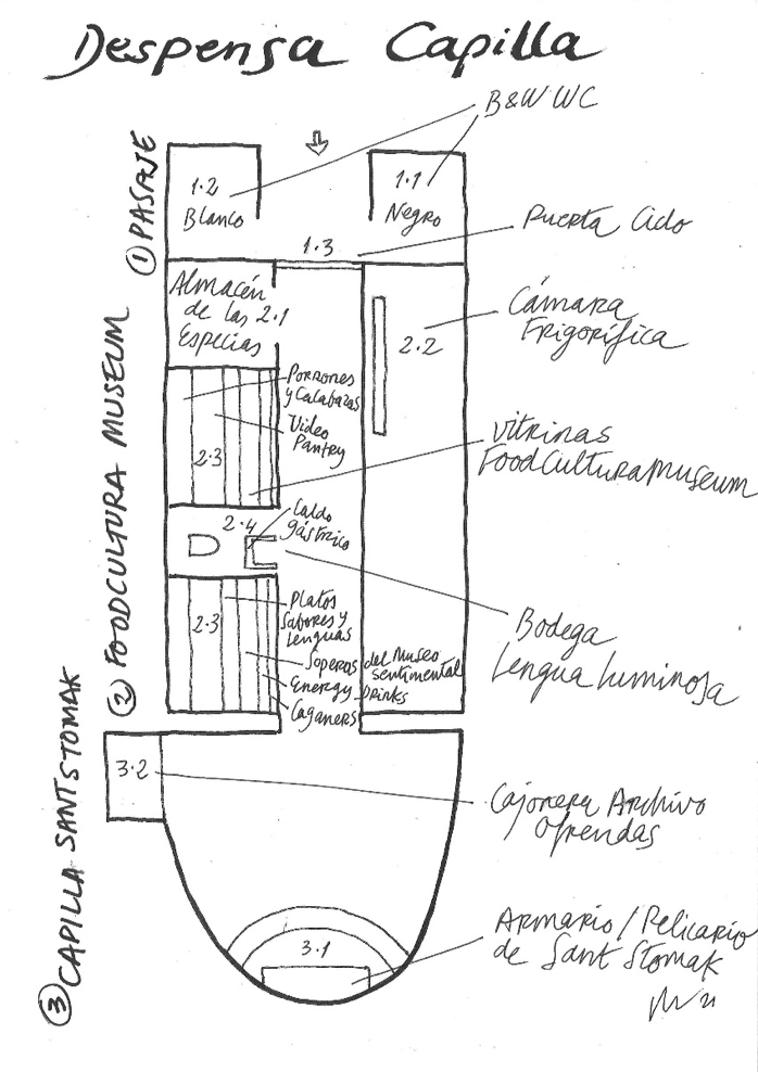 Por último, al final del espacio se encuentra la capilla Sant Stomak: en el centro del ábside semicircular de color turquesa y magenta se encuentra un armario/relicario, receptáculo de ofrendas creado a partir de la imagen de un exvoto napolitano de latón que se encuentra en los archivos del Museo de las Civilizaciones de Europa y del Mediterráneo de Marsella. Se trata de un icono ritual que nace de la necesidad de reflexionar sobre la cultura alimentaria y la ofrenda, con el lenguaje propio de la práctica artística.