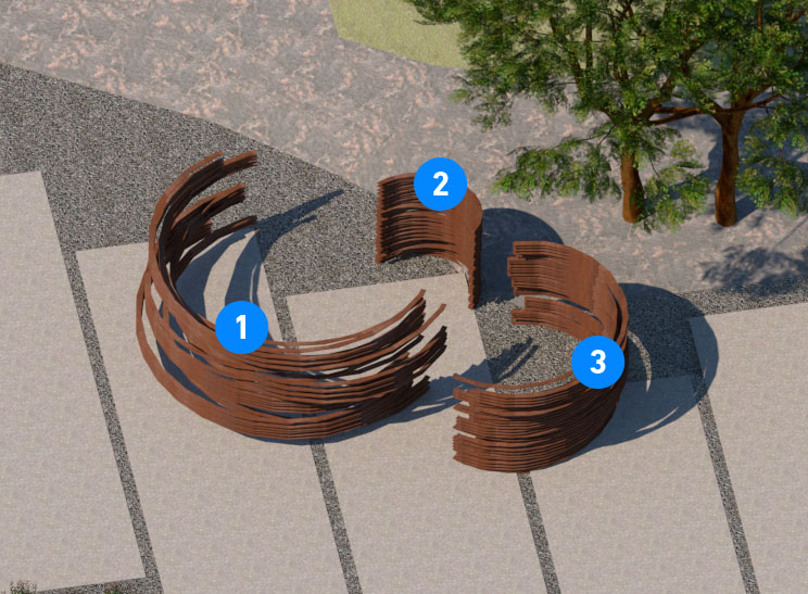 La instal·lació consta d'una primera part on apareixen algunes frases que expliquen com de les necessitats neixen les accions de l'ésser humà i com s'agrupen en àmbits i activitats econòmiques a través de les professions i les disciplines acadèmiques.