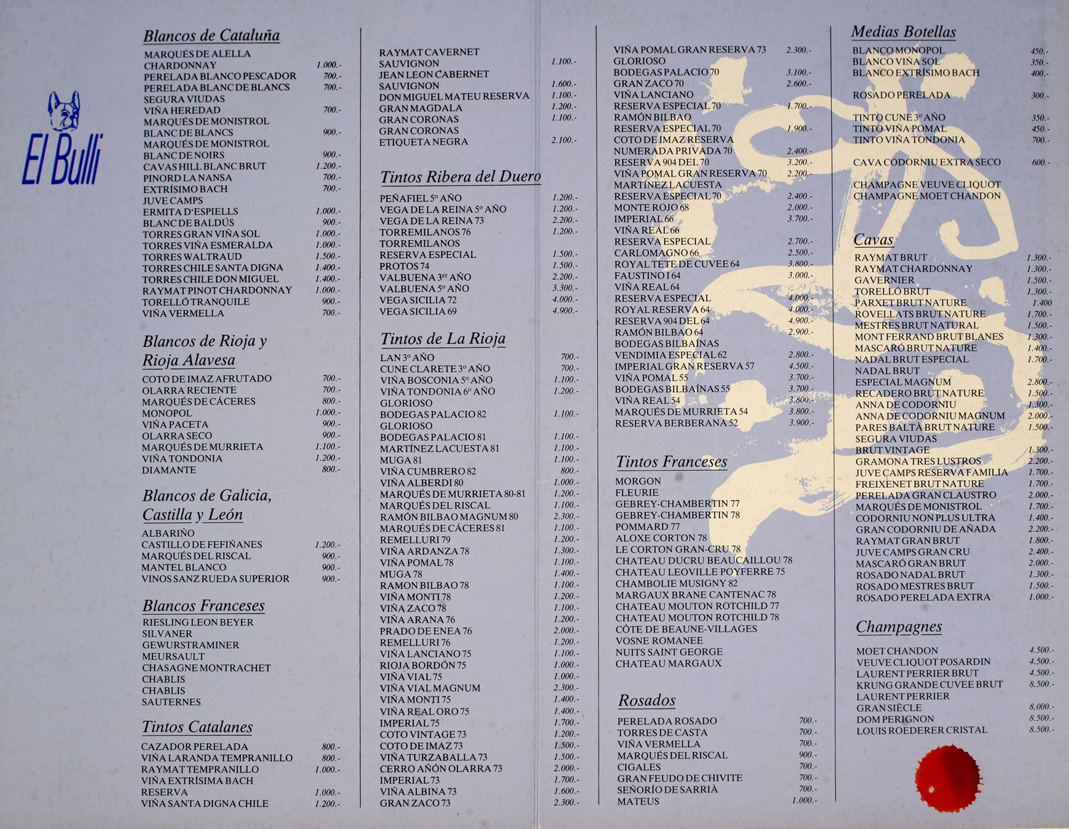 Amb més de 1.800 referències a la carta, l'equip de sommeliers atenia de manera personalitzada cadascun dels comensals, i alhora mantenia l'equilibri constant en una difícil relació amb la varietat gustativa i aromàtica de les elaboracions que conformaven el menú degustació i el ritme que el seu servei (amb més de 45 passis) exigia.