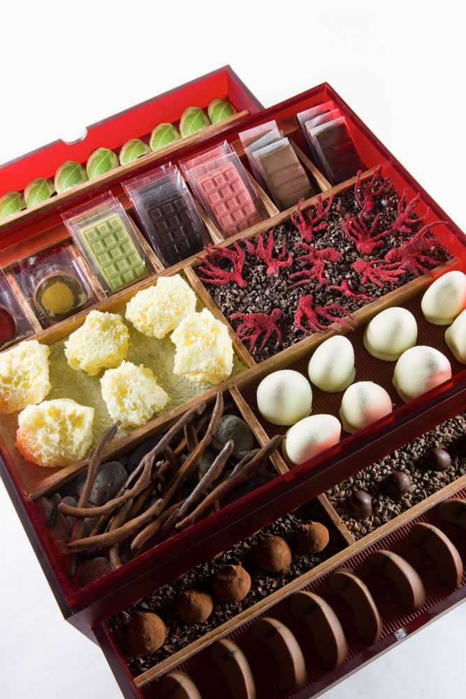 Fila de blat de moro i xocolata blanca. Maduixes liofilitzades banyades amb xocolata blanca, maduixa liofilitzada amb forma de corall, esponja de fruita de la passió amb iogurt i xocolata blanca, rajoles de xocolata negra i de xocolata amb llet i fruita seca, rajoles de xocolata amb maduixa i te verd, monedes de soja i xocolata blanca, monedes de xocolata negra amb albercoc i mango.