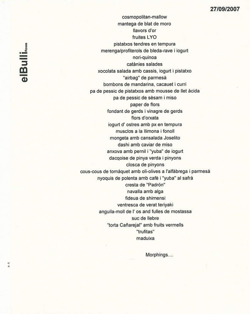 Cette projection montre précisément la mise en scène et la présentation de tous les plats composant un menu dégustation servi à elBullirestaurante en 2007.