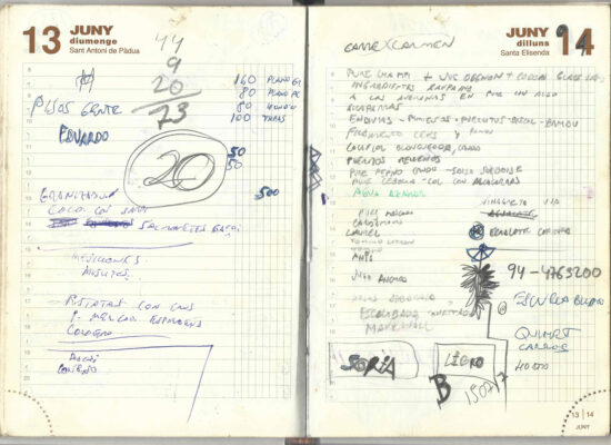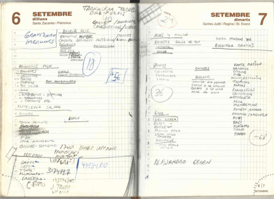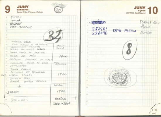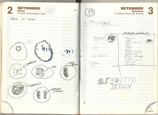 Observaciones: Listado de platos, listado de elaboraciones y dibujos de platos. También aparece el primer granizado salado de mejillones.