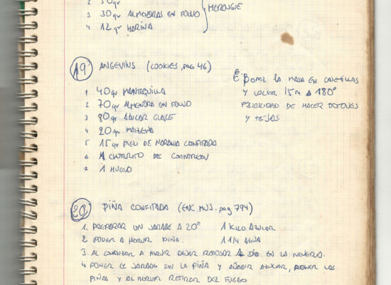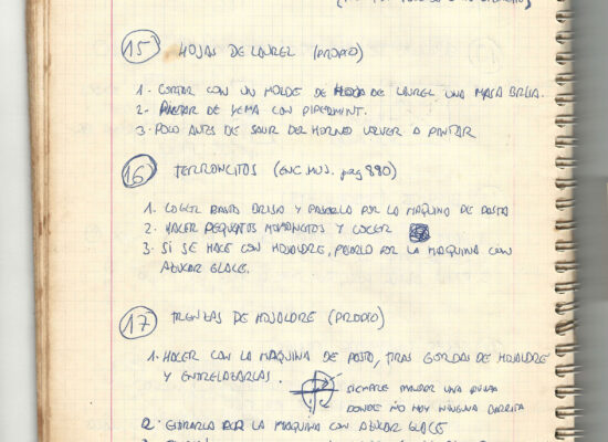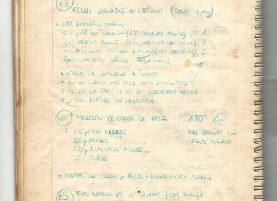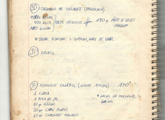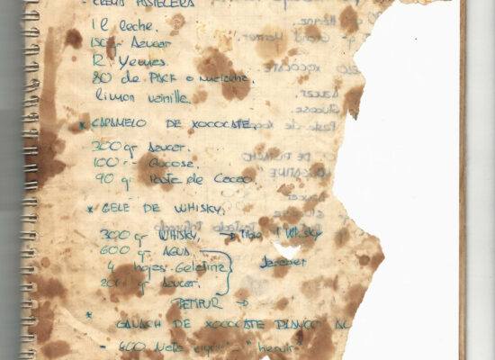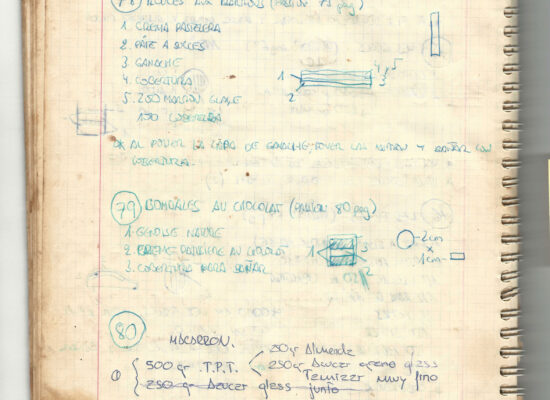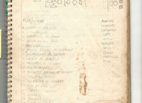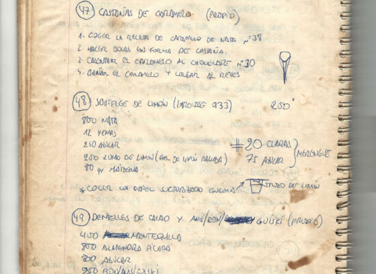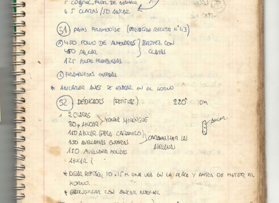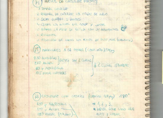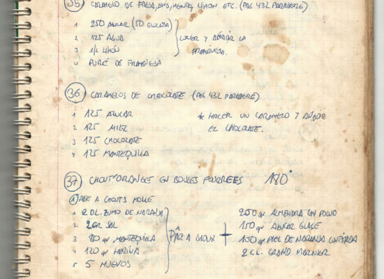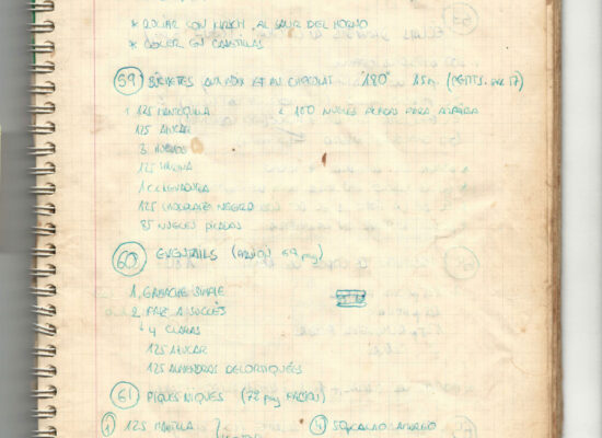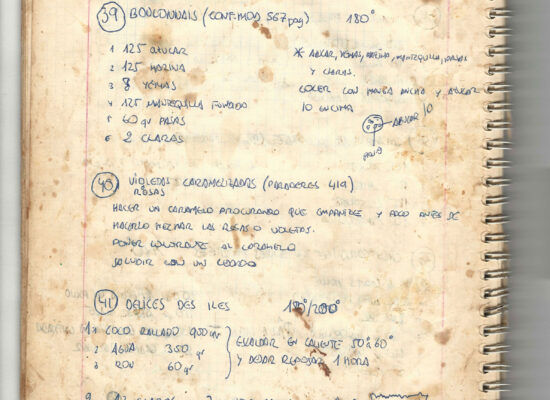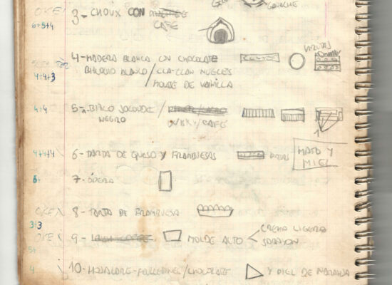 Observaciones: Recetas de tartas y pasteles. Listado de decoraciones con chocolate. Recetas propias y de libros. Lista de ideas para postres y pasteles. Listado de pasteles y petit-fours. Listado mise en place evento Vitoria.