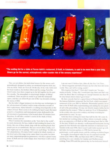 tipo de artículo: Reportaje idioma: Inglés fecha: 01/05/2004 protagonista: Ferran Adrià medio: EVERYTHING SPAIN (East Sussex) página del artículo: 48