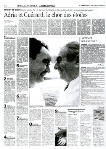 tipo de artículo: Entrevista idioma: Français fecha: 28/09/2002 protagonista: Ferran Adrià medio: LE FIGARO (Francia) (PARIS CEDEX 02) página del artículo: 18
