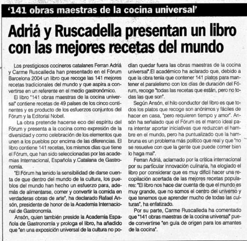 lo que se ha escrito > Búsquedas > Resultados > Adrià y Ruscalleda presentan un libro con las mejores recetas del mundo imprimir