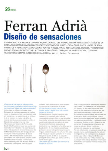 Catalogado por muchos como el mejor cocinero del mundo, Ferran Adrià a sus 43 años es un diseñador gastronómico en constante crecimiento. Libros, catálogos, dvd’s, líneas de ropa?.
