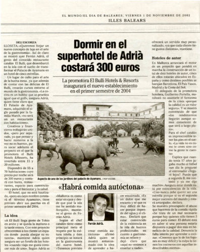 La promotora El Bulli Hotels & Resorts inaugurará el nuevo establecimiento en el primer semestre de 2004.