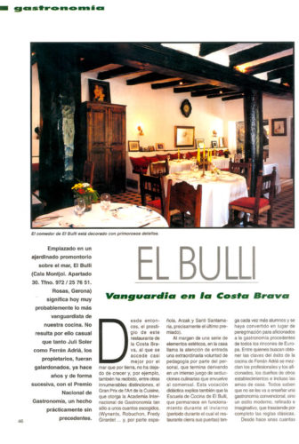 Emplazado en un ajardinado promontorio sobre el mar, El Bulli, significa hoy muy probablemente lo más vanguardista de nuestra cocina. No resulta por ello casual que tanto Juli Soler como Ferran Adrià, los propietarios, fueran galardonados, ya hace años y