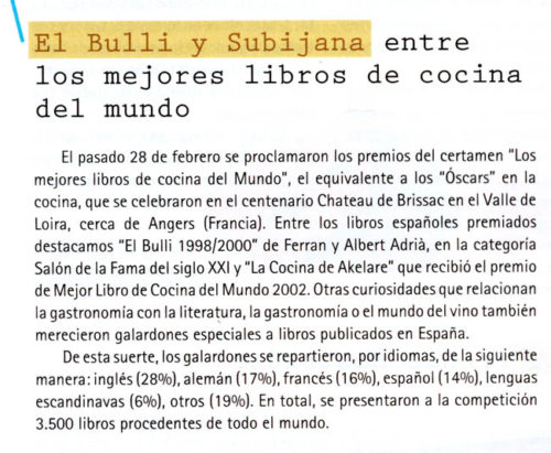 lo que se ha escrito > Búsquedas > Resultados > El Bulli y Subijana entre los mejores libros de cocina del mundo. imprimir
