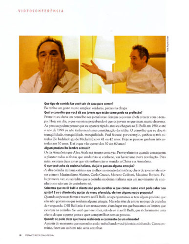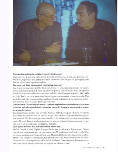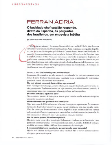 tipo de artículo: Entrevista idioma: Portugués fecha: 01/12/2007 protagonista: Ferran Adrià medio: PRAZERES DA MESA (Pinheiros) página del artículo: 16