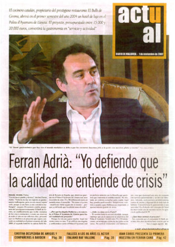 El cocinero catalán,propietario del prestigioso restaurante El Bulli de Girona, abrirà en el primer semestre del año 2004 un hotel de lujo en el Palau d’Ayamans de Lloseta.El proyecto, presupuestado entre 15.000 y 20.000 euros, convertirá la gastronomia e