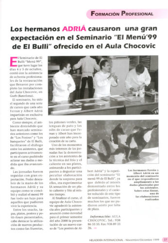 lo que se ha escrito > Búsquedas > Resultados > Los hermanos Adrià causaron una gran expectación en el Seminario El Menú ’99 de El Bulli ofrecido en el Aula Chocovic imprimir